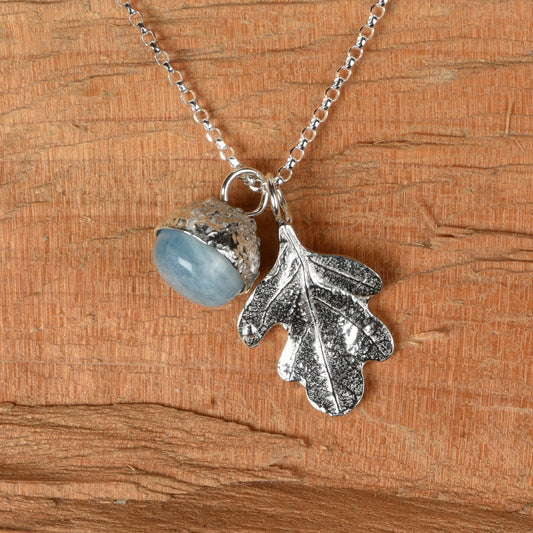 Aquamarine Acorn & Oak Leaf Pewter Necklace | March Birthstone Gifts