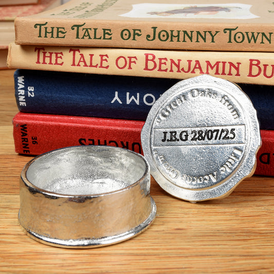 Feuille de chêne et gland personnalisé boîte de baptême en étain cadeaux gravés