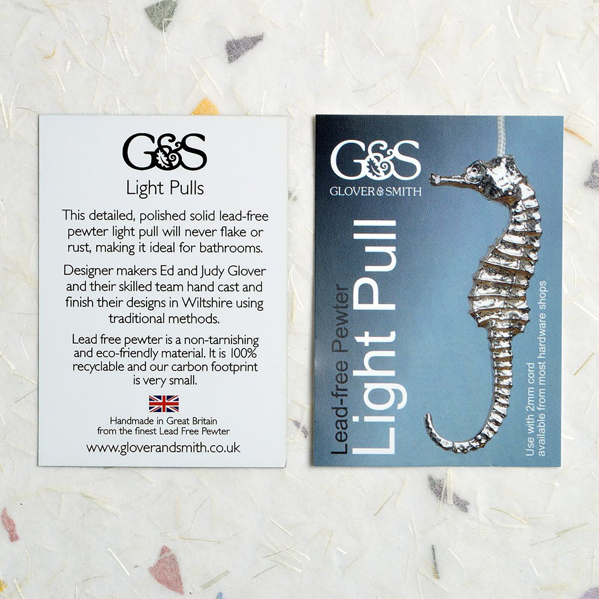 Solid lead-free pewter is ideal for kitchens and bathrooms because the surface of your dragonfly light pull will never flake (like plated items) or rust and will not tarnish like old pewter (that was the lead content). All our designs are completely nickel-free and made exclusively by us in Wiltshire, England.