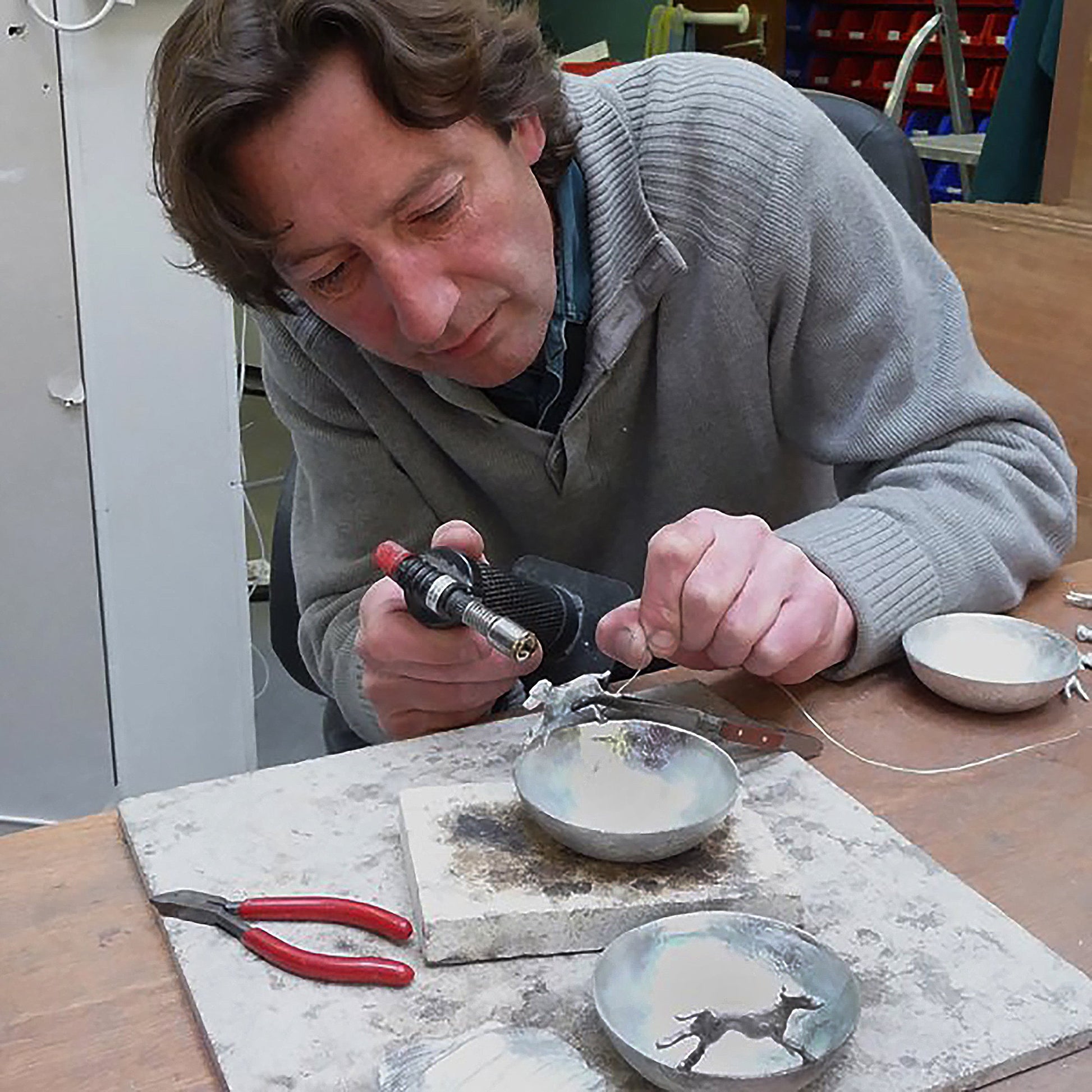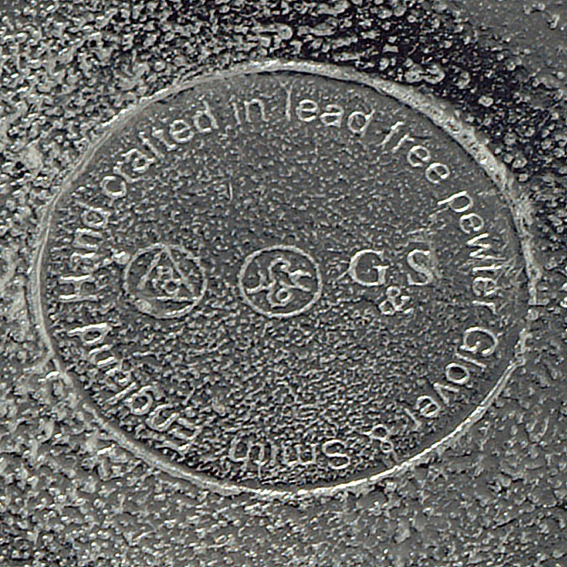 Every Glover and Smith fox and hound bowl and spoon set is hand crafted from polished, solid lead-free English pewter which is non-tarnishing (that was the lead in old pewter) and completely nickel-free and food safe. Because our designs are all created in solid metal, the surface of your bowl will never flake like a silver plated bowl. To clean, simply wash with warm soapy water.