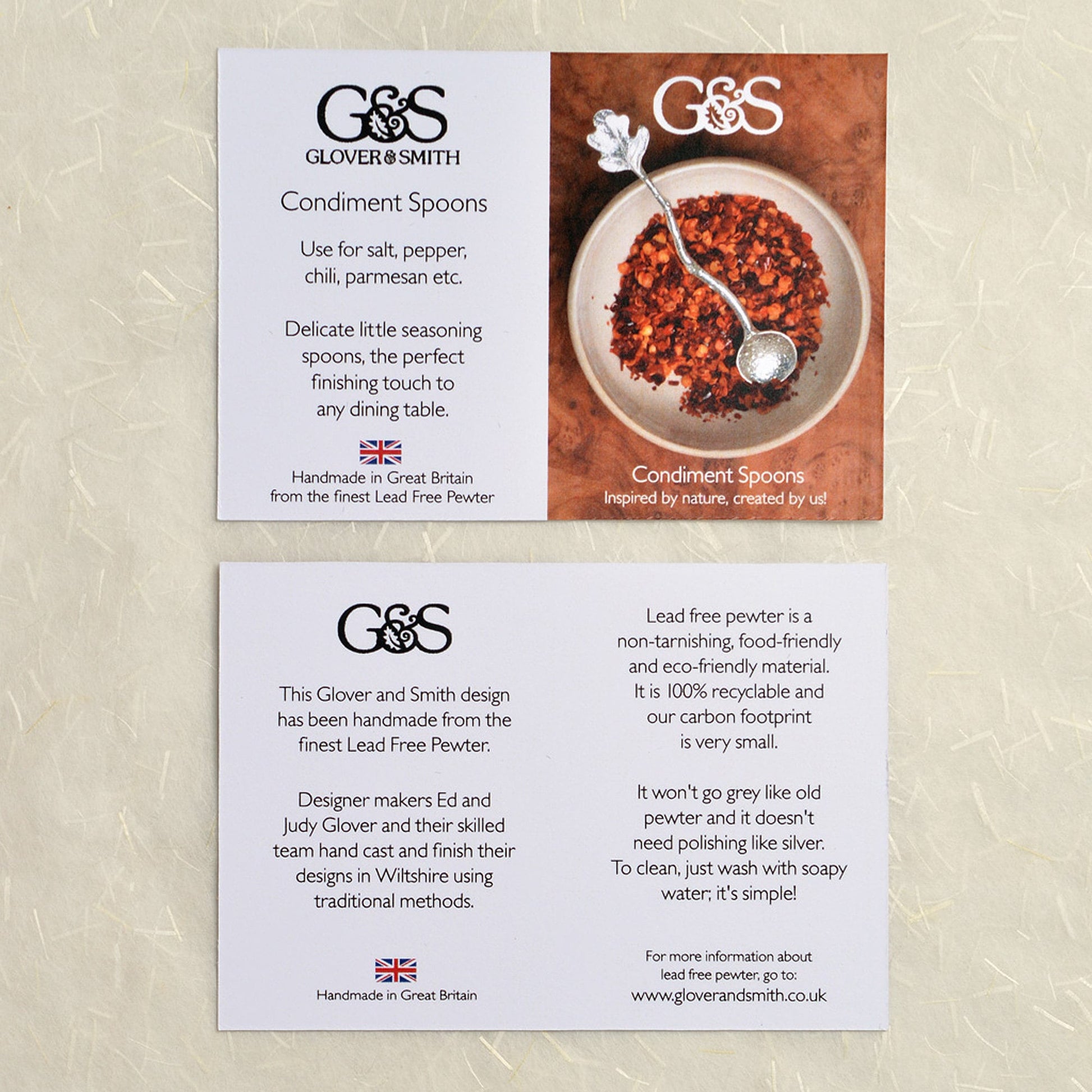 A delicate and beautifully textured tiny condiment spoon, perfect for small amounts of salt, pepper, chilli flakes or other spices and herbs. This dainty little lead-free pewter spice spoon, salt spoon, tiny spoon has an oak leaf on the end of a thin twig handle. The perfect finishing touch to any table.