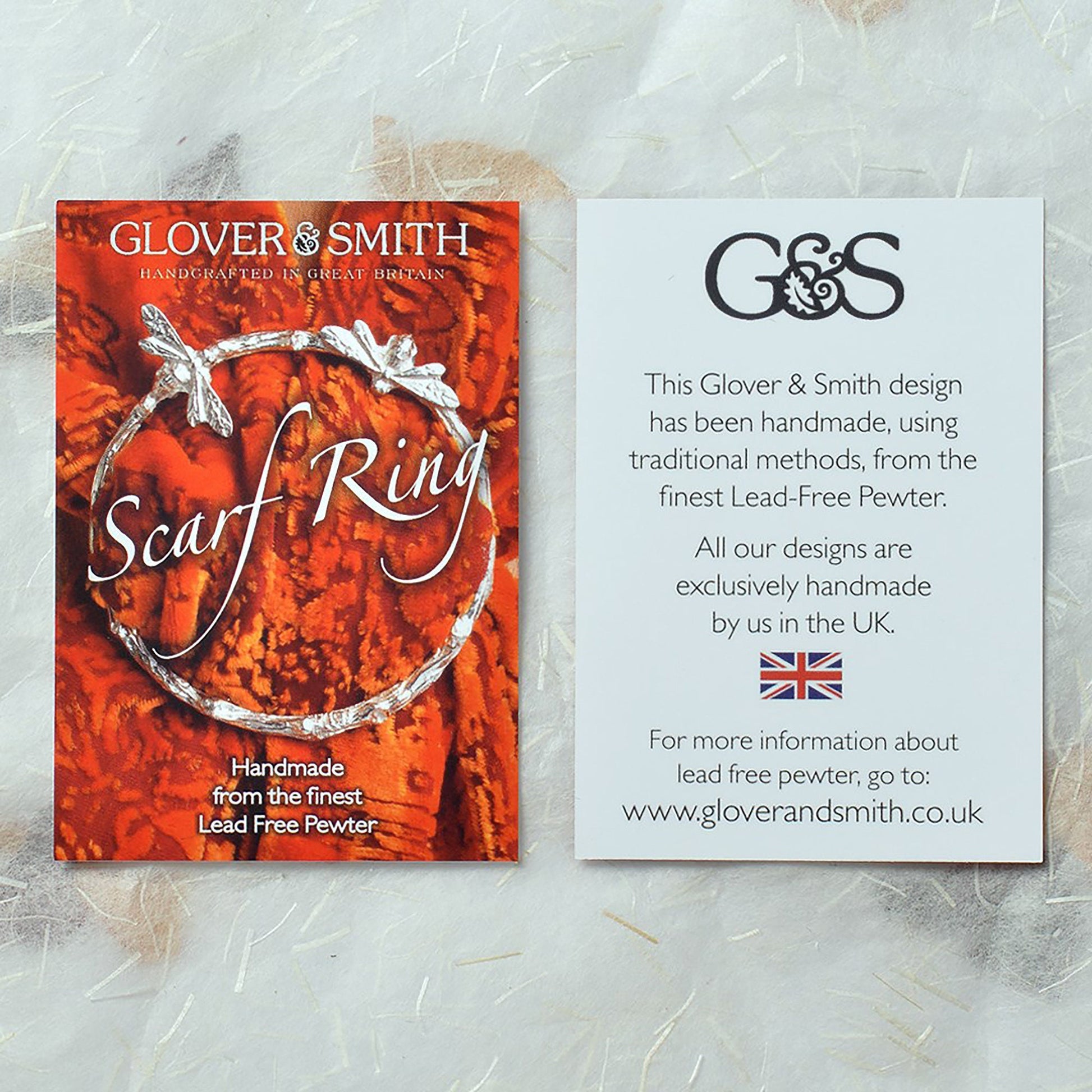 Each scarf ring is made from polished lead-free pewter which is non-tarnishing (that was the lead in old pewter). Our 95% tin Pewter is the fourth most expensive metal in common use after platinum, gold and silver. We use solid metal which means the surface of your sycamore key scarf ring will never flake like a silver plated scarf holder. Simply wash with warm soapy water to clean. All our designs are completely nickel-free and made exclusively by us in Wiltshire, England.