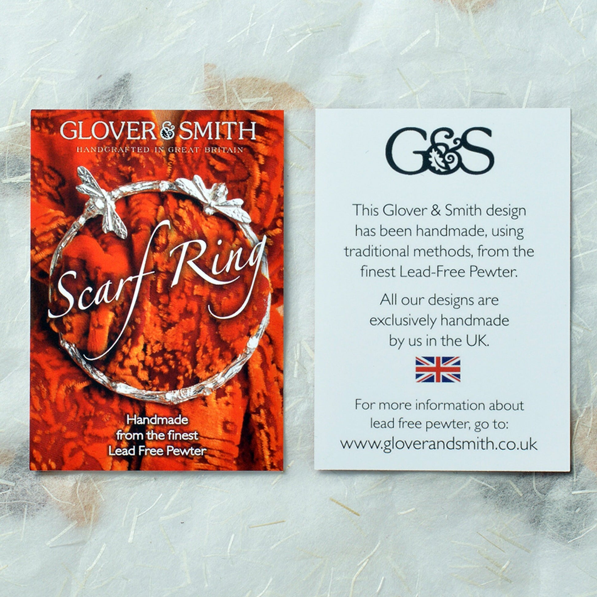 All Glover and Smith designs are made from solid polished lead-free pewter which is non-tarnishing (that was the lead in old pewter). Our 95% tin Pewter is the fourth most expensive metal in common use after platinum, gold and silver. Because we use solid metal the surface of your Thistle scarf ring will never flake like a silver plated scarf ring. To clean just wash with warm soapy water. All our designs are completely nickel-free and made exclusively by us in Wiltshire, England.